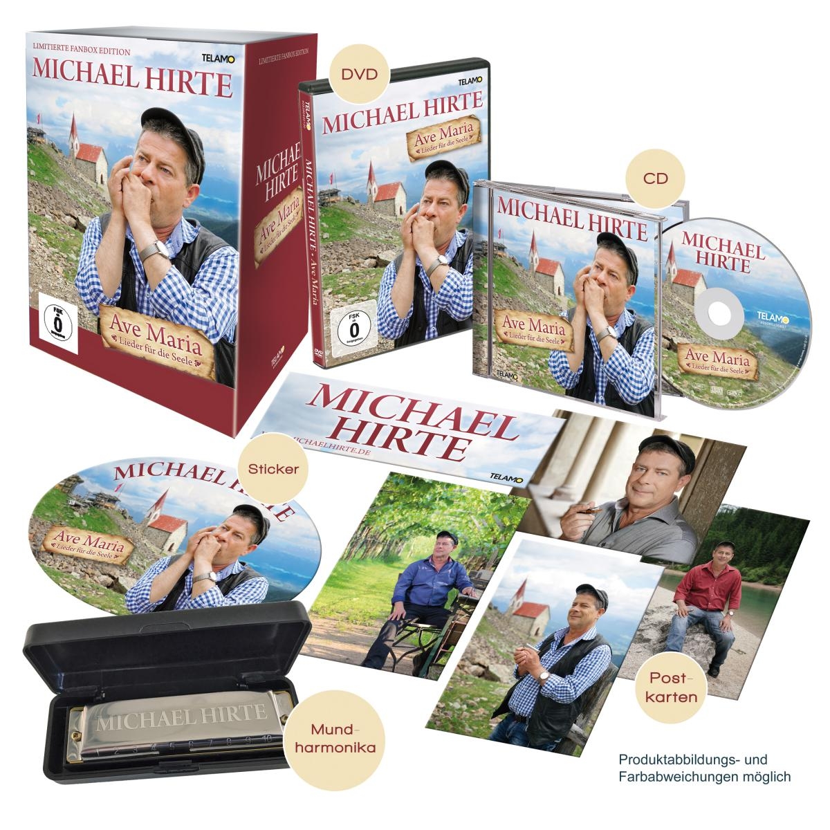 Die CD und DVD „Ave Maria – Lieder für die Seele“ gibt es erstmalig auch als Fan-Box mit einer limitierten Michael Hirte-Mundharmonika zum Mitspielen. Keine Angst vorm ersten Mal – sie finden schon den richtigen Ton, wenn sie sich darauf einlassen und die Harmonie spüren, die uns Michael Hirte mit seiner Musik schenkt. „Ich hoffe sehr, dass ich Euch noch viele weitere Jahre mit meiner Musik berühren und bewegen darf. Jetzt wünsche ich Euch viel Freude mit meinem neuen Album AVE MARIA.“